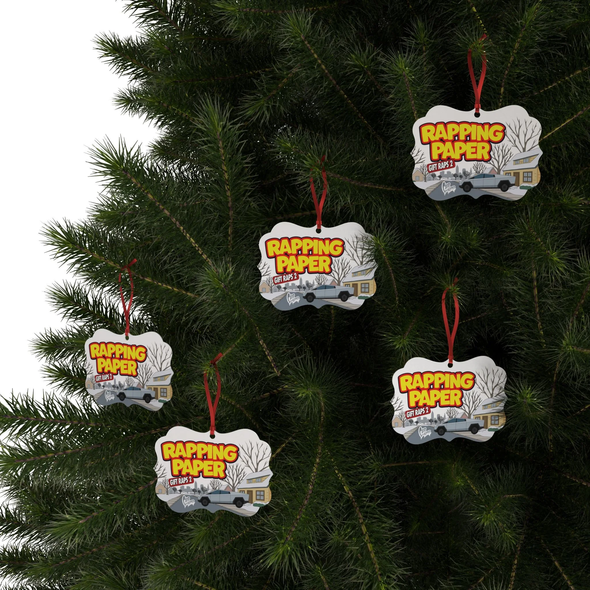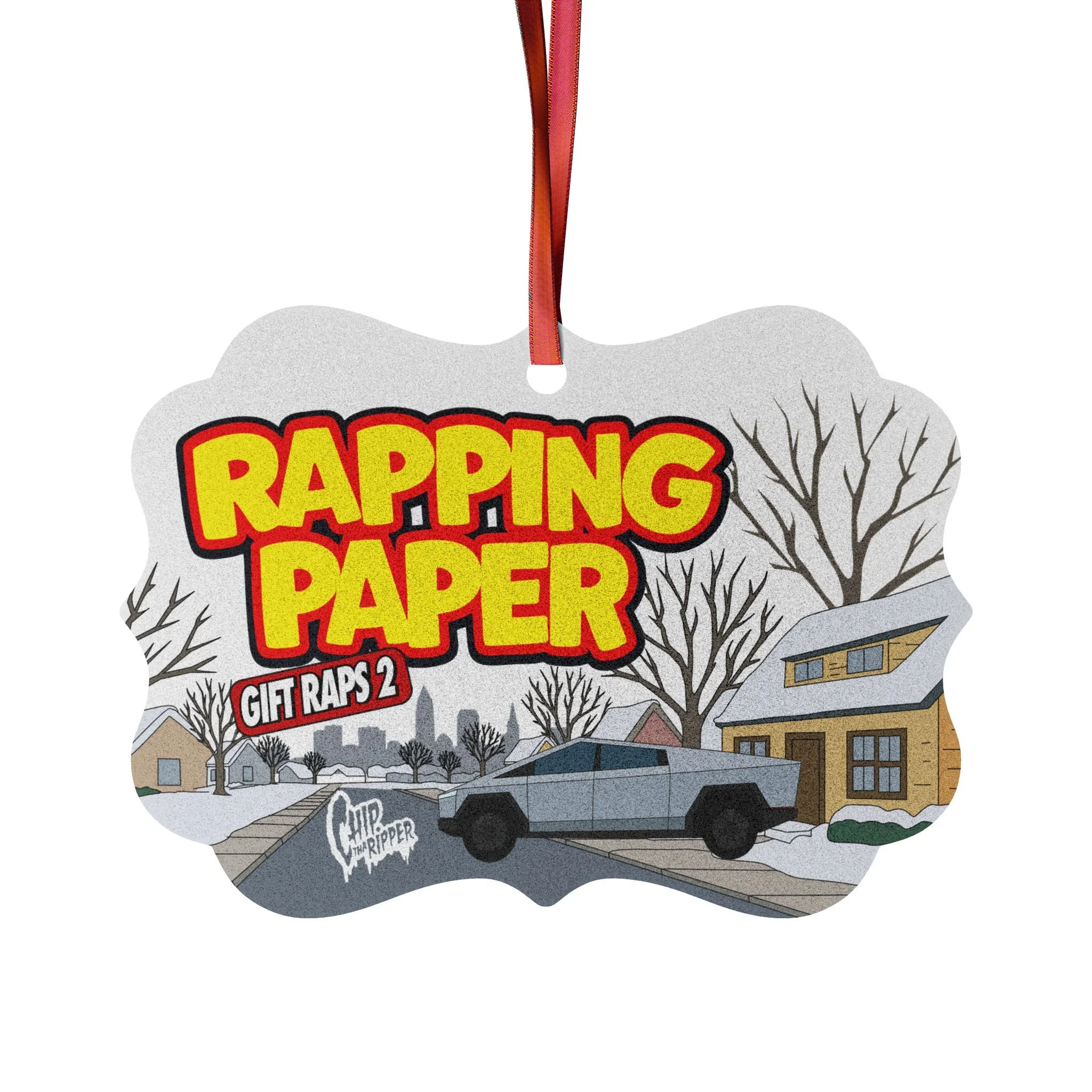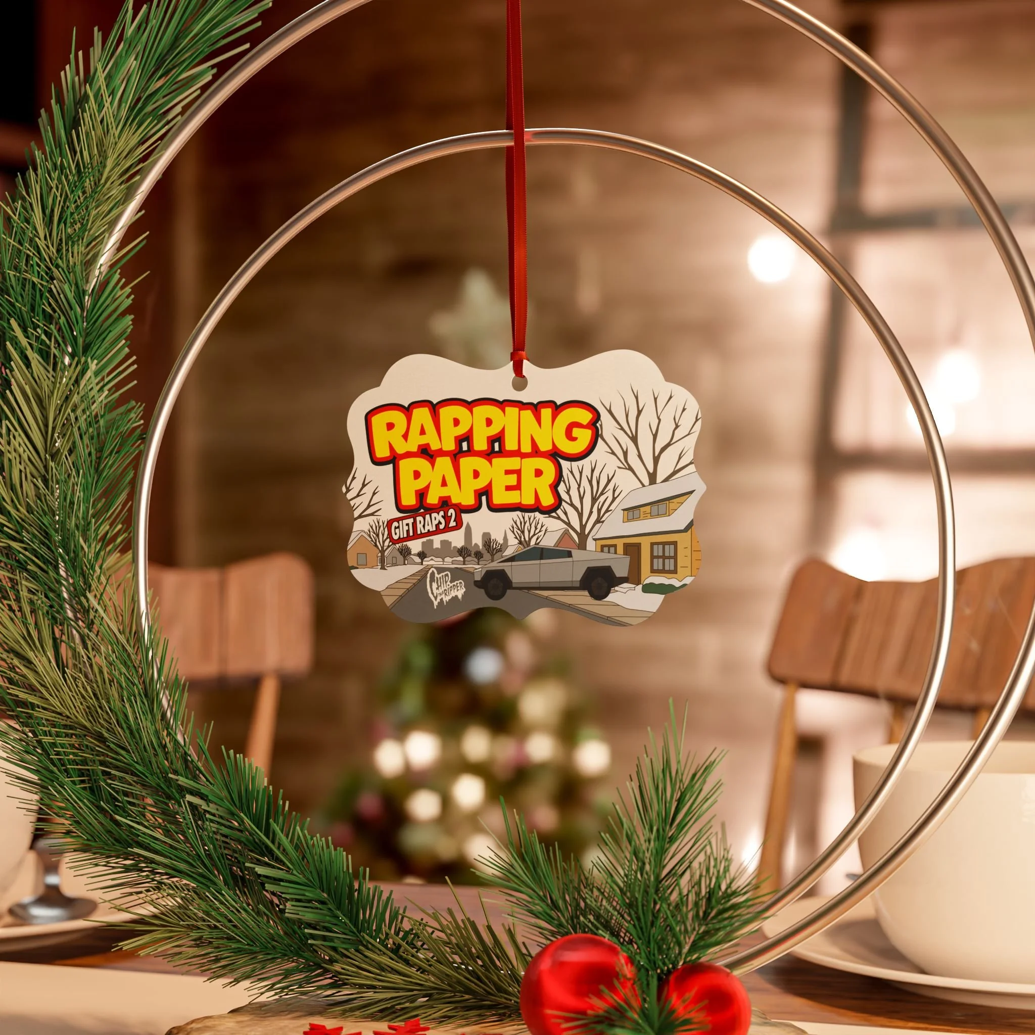 "Rapping Paper" Aluminum Ornament Holiday Car & Suburban Scene (Custom Christmas Tree Decoration)