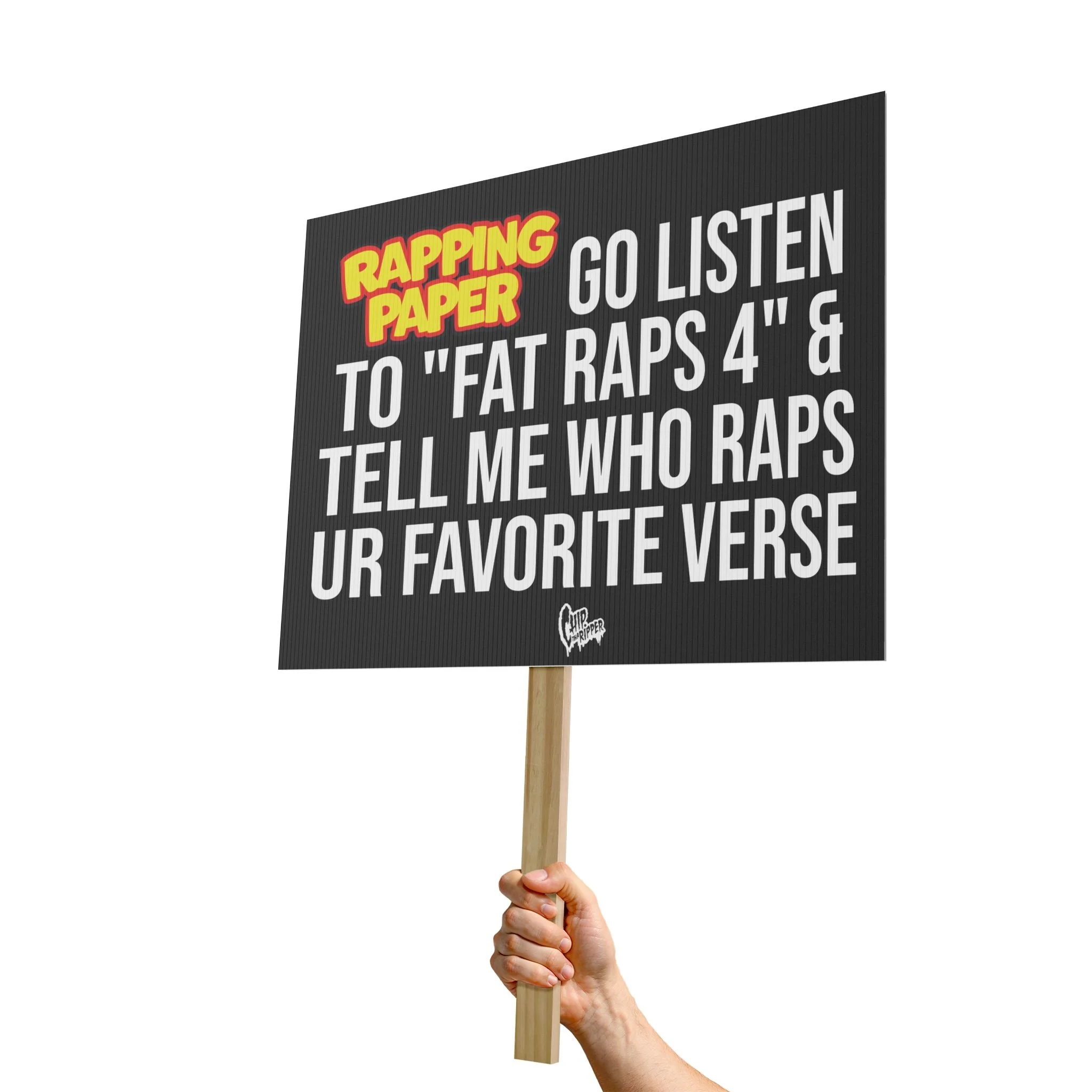 This hand-held "FAT RAPS 4 Rally Placard" brings your message to the streets with clarity and durability. Printed on fluted polypropylene with UV inhibitors and Greenguard UL certified water-based inks, the 18" x 24" panel resists fading, water, and stains so your words stay bold through rallies and outdoor events. The radiata pine handle attaches easily with double-stick tape—just remove the adhesive backer and press to secure—giving you a sturdy grip for marching or holding up at speeches. One-sided printing keeps the front crisp and readable while the lightweight construction makes it easy to carry for hours. Use it for demonstrations, rallies, community events, or any gathering where your voice needs to be seen.