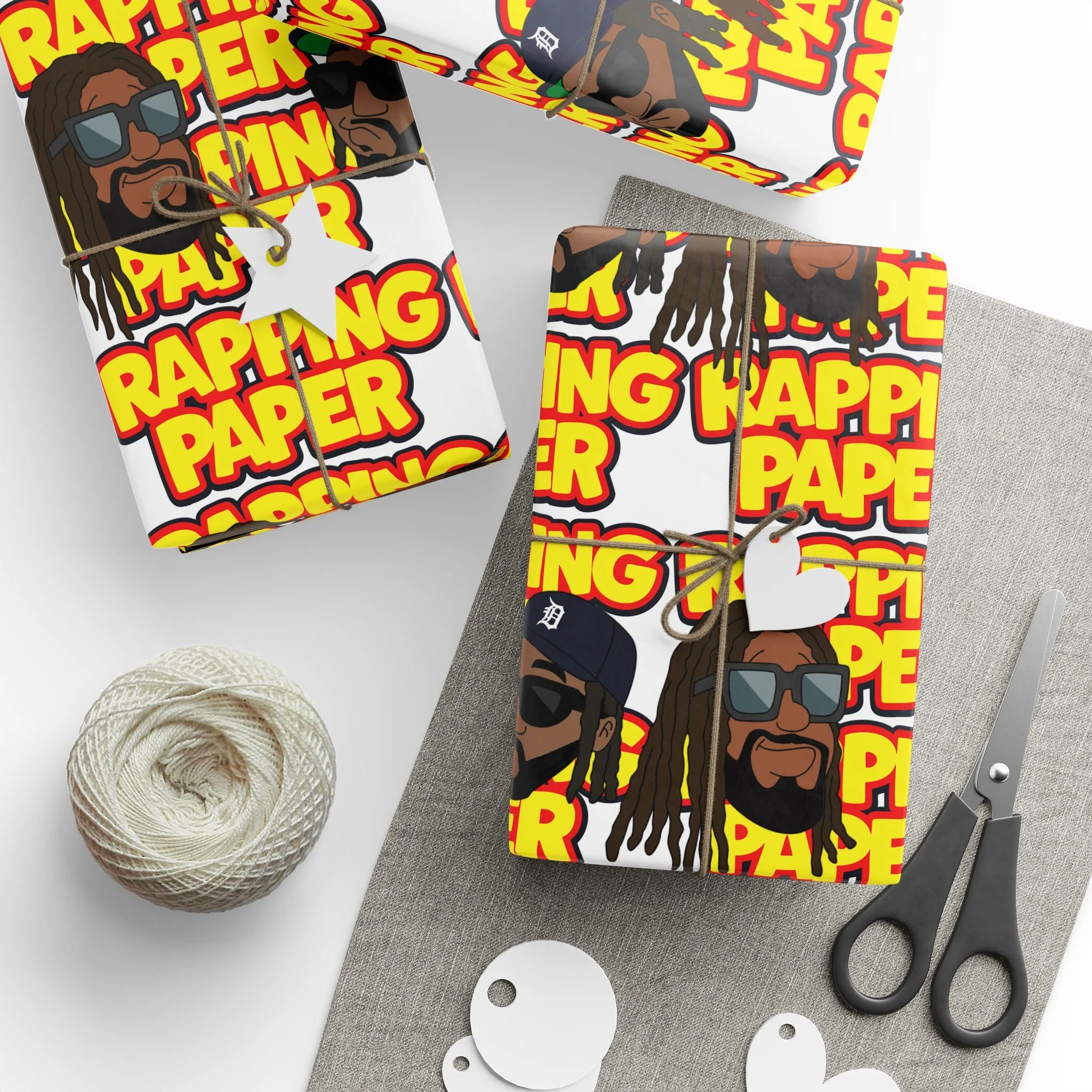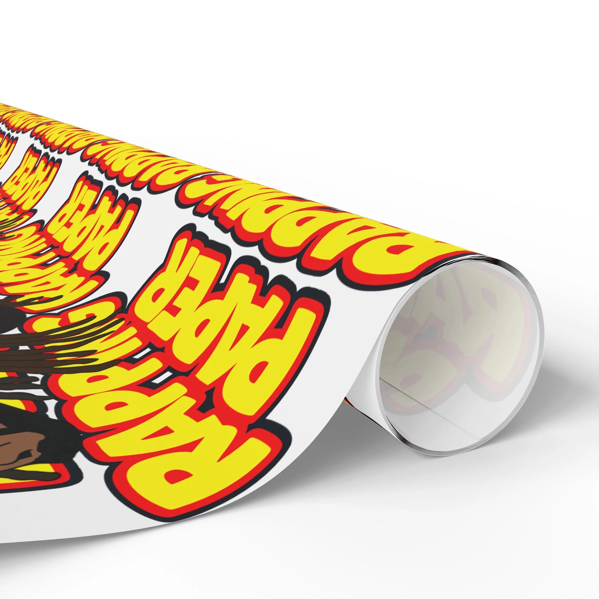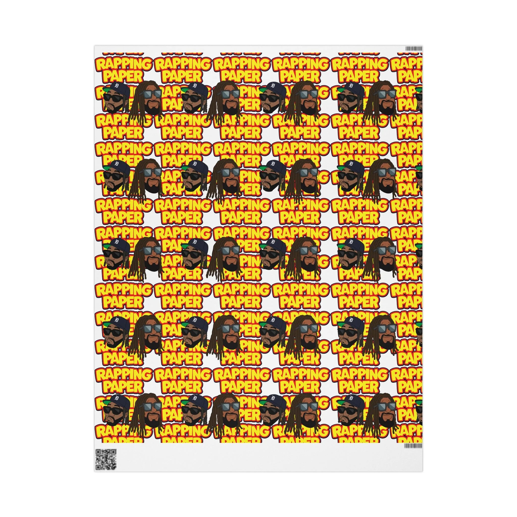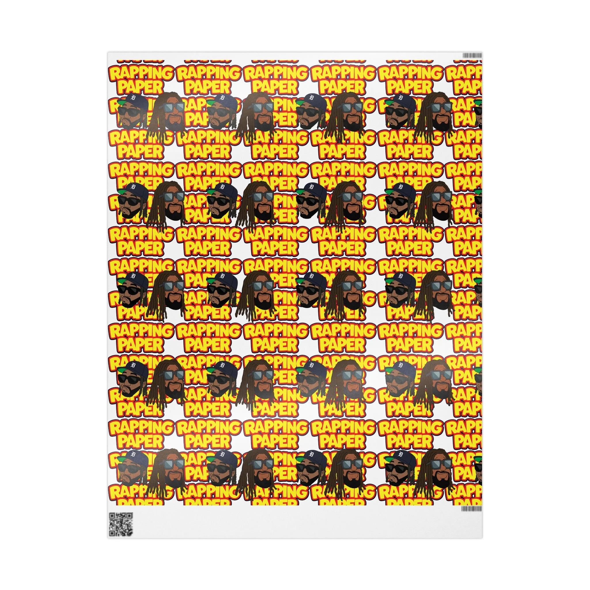 Bright, bold "Rapping Paper" wrapping paper that brings energy to any gift. The design repeats a playful, graffiti-style “RAPPING PAPER” motif with vibrant yellows, reds and greens and illustrated faces—like a cheeky shout-out to hip-hop culture. Printed on heavyweight 90gsm fine art paper, it lays flat and folds crisply while letting the artwork pop whether you choose glossy or matte finish. Sizes range from small sheets to long rolls so you can wrap everything from small boxes to oversized parcels. A subtle white production border with a QR code sits at the edge, easy to trim away if you want an uninterrupted pattern. Use it when you want your wrapping to be noticed and to add a lively, music-centric vibe to the moment.